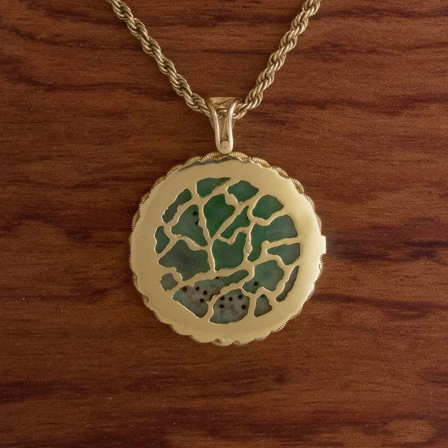 The centerpiece of this pendant/chain set is the antique Chinese jade pendant with a stylized phoenix carved into it. The previous owner had it mounted in the 1980s in this non-damaging gold bezel designed to look like the accompanying chain, with an abstract cut-out pattern on the back.