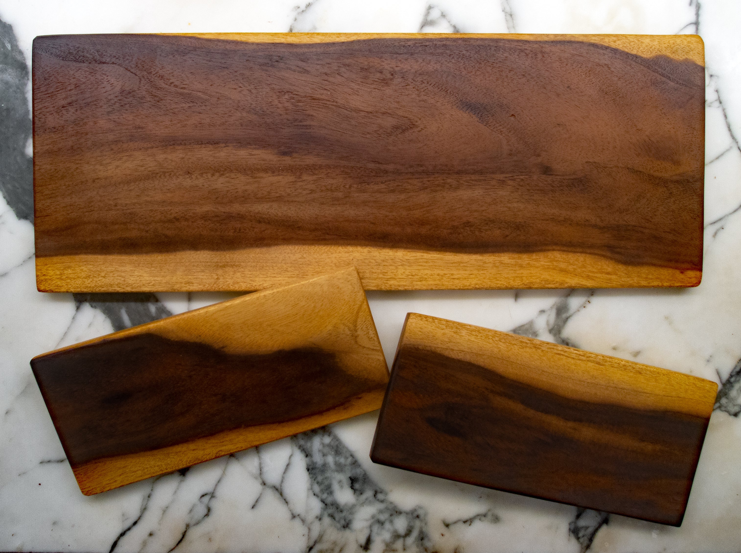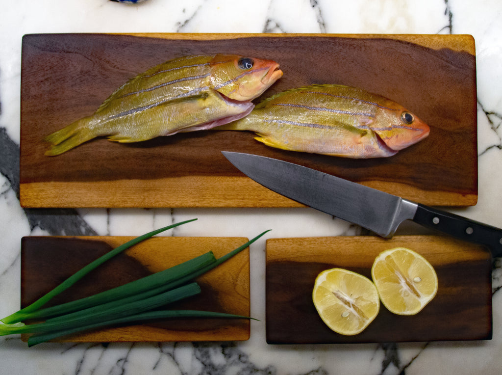 Like any man with a workshop, I have several offcuts of wood in my house. I chose kou (Cordia subcordata), an indigenous Hawaiian wood that was also brought as a canoe crop to the islands by the kupuna. Kou is known to not impart any flavor to food prepared on it, making it a popular choice for umeke, papa kuʻiʻai and utensils. I had enough kou to make one larger longish cutting board, and two smaller ones—sometimes you just need to cut a lemon or piece of cheese and don't want to use a big board! I oiled them up with a food-safe sealing wax, and took them straight to the kitchen.