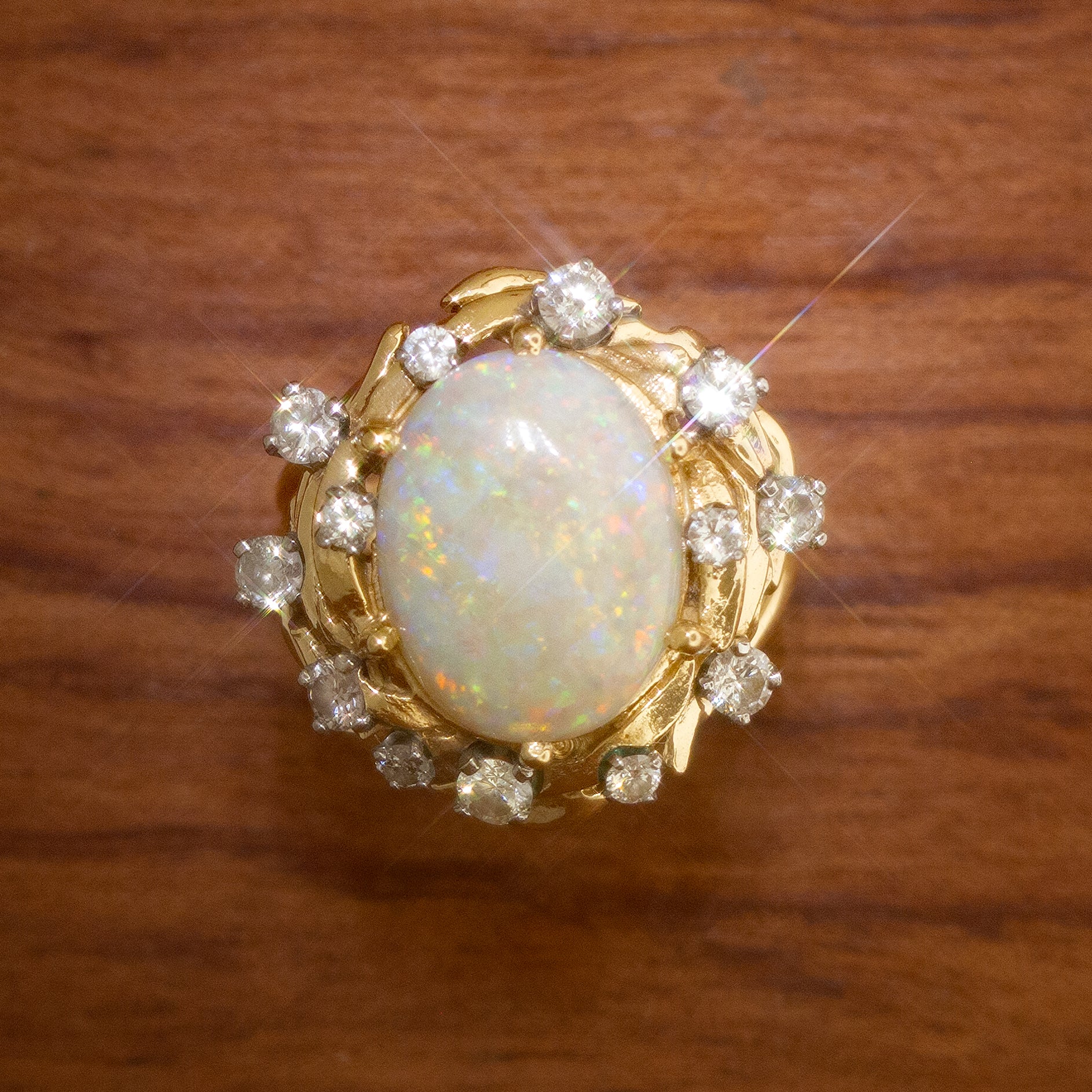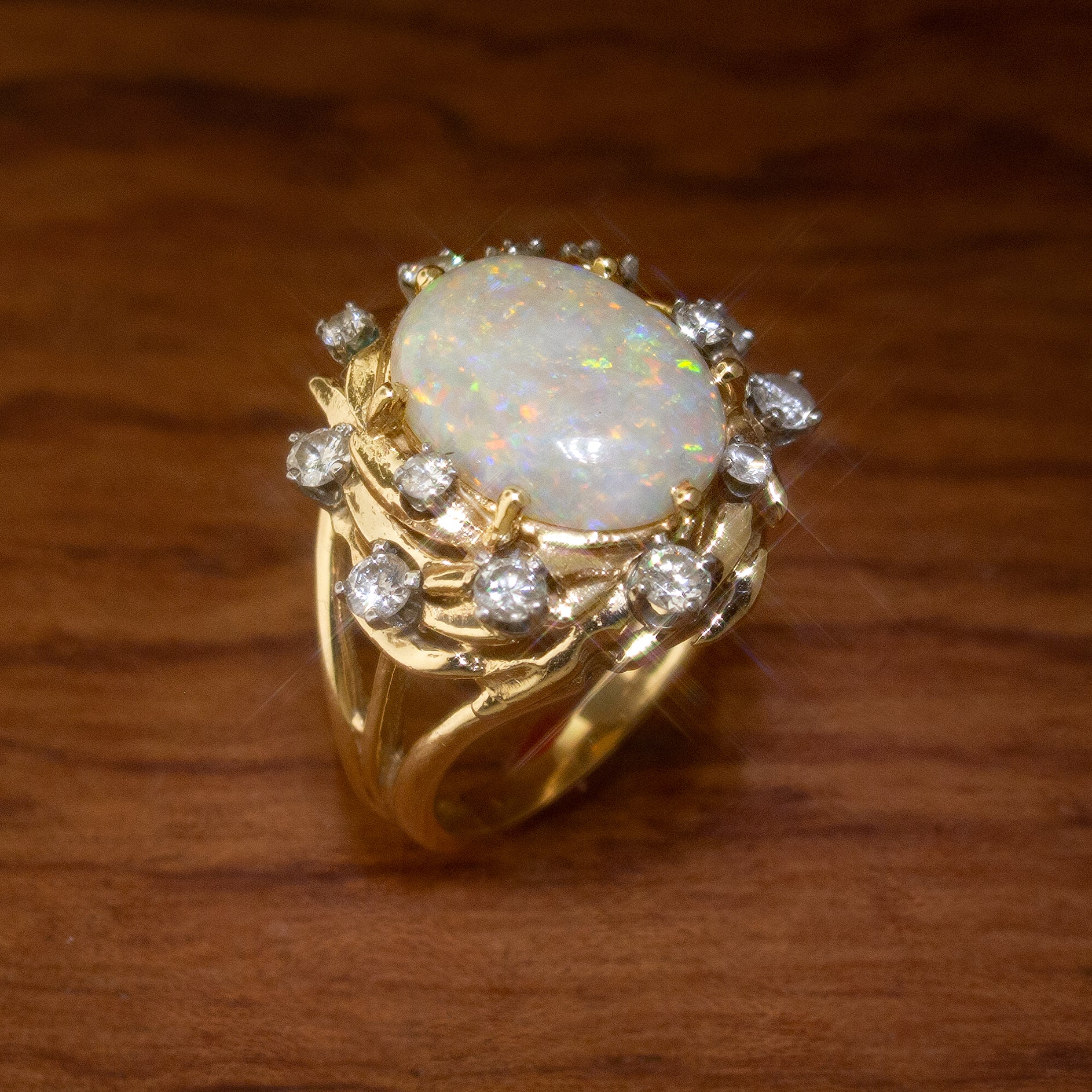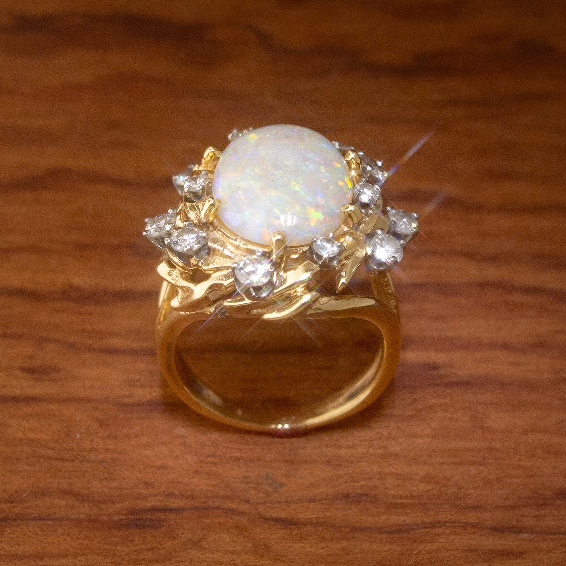 This stunning vintage piece starts and ends with the magnificent 16mm x 12mm opal, weighing in at approximately three carats. This brilliant center stone is surrounded by a wreath of gold embellished with thirteen diamonds totaling approximately 1.1 carats in weight.